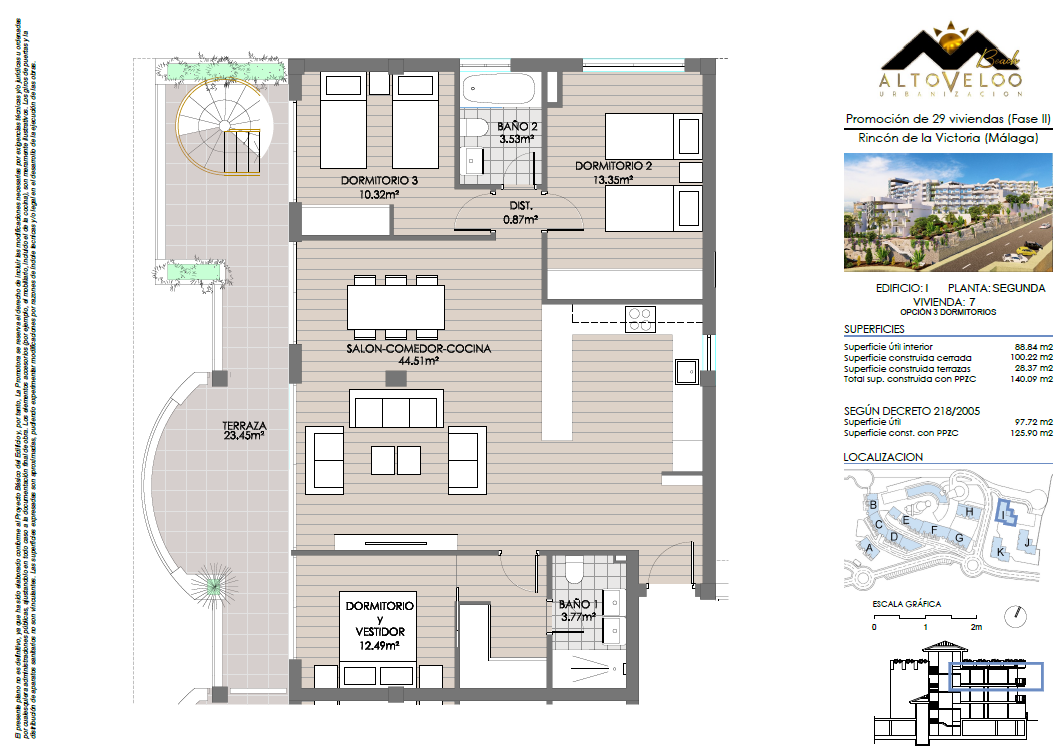 Viviendas de 2 dormitorio, con vestidor muy amplios, de hasta 72 m2 , con terrazas de hasta 62 m2 , y excelentes vistas al Mediterráneo.